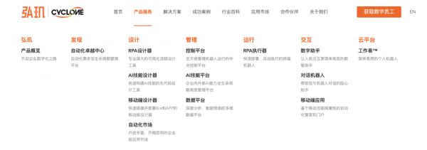 弘玑 Cyclone,2015年成立,去年9月完成4000万美元的B轮融资,DCM中国、源码资本、经纬资本、联想创投参投弘玑。与云扩思路相似,它将产品分为5个板块,从发现、设计、数字员工、平台,到云产品。官网显示,弘玑 Cyclone服务于500+银行、证券、保险、政府、能源、制造、医疗、电力等行业中的客户。