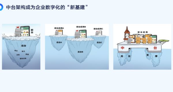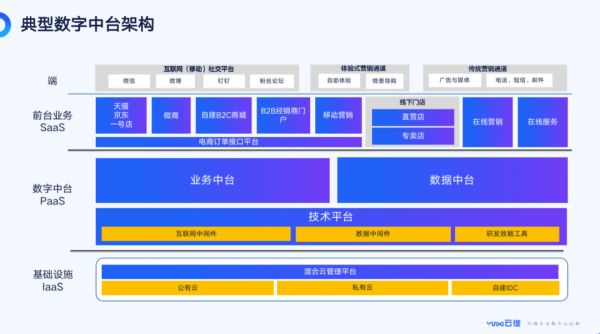 典型的中台架构会分成四层:最底层是基础设施层,帮助企业把能力和企业运作放到云计算平台,如今业务上云已经变成了必选项,是一家企业能不能成为一个社会有机体必须要走的一步;上一层是企业能力中心(数字中台),也就是业务中台和数据中台;