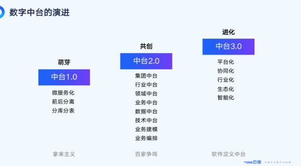 我们具体来看中台的演进过程。中台开始于2016年,中台1.0是微服务化,把企业固化的IT系统变成小碎片形成微服务化,这种结构带来的好处是前后端分离、效率提升,通过分库分表模式支撑大并发和高效,但主要解决基于C端系统带来的效率性问题;