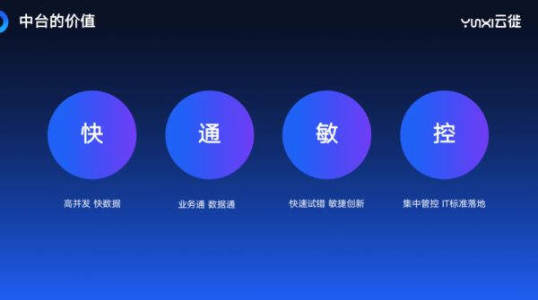 「通」体现在所有端都与中台打通,通过中台主板黏结所有端的业务,实现一切业务数据化,再通过统一数据处理反哺业务运营,最终形成闭环;「敏」体现在快速试错、快速迭代,快速推进业务创新;「控」体现在能够形成集中的IT资源源头管控,之前是流程管控。