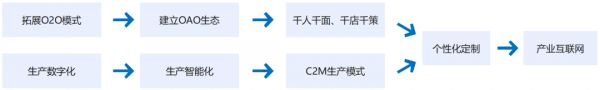 无论在产业链的哪个环节,以个性化定制为方向的智能化升级都是实现产业互联网的过程。而“OAO+C2M”,也就是线上线下融合的个性化按需定制生产,则是产业互联网最终也是最为典型的模式。