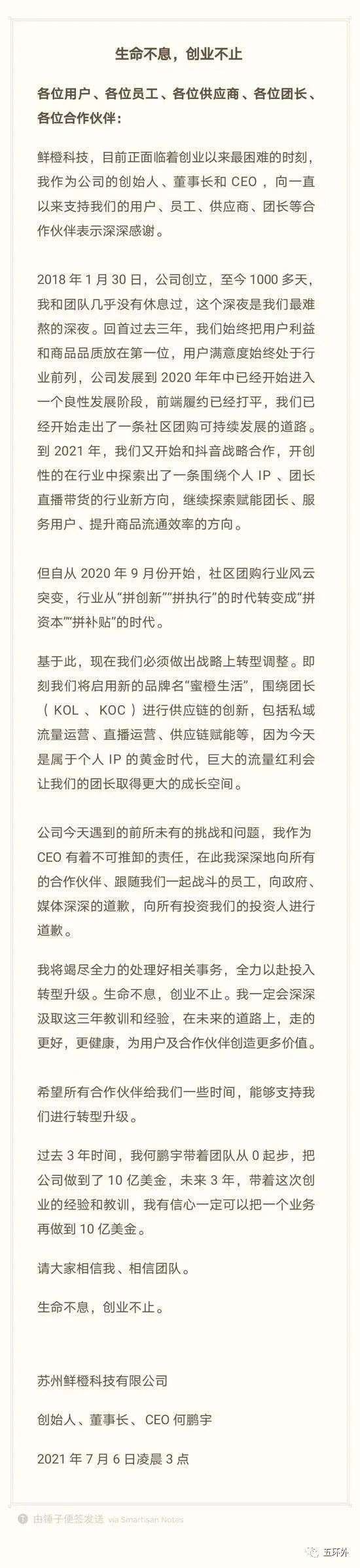 这是第一家宣布破产的社区团购独角兽。宣布破产一天前,“同城生活”更名为“蜜橙生活”,标志将从C端业务转向B端,开始转型。此外,创始人何鹏宇的信在供应商内部流传,宣布“公司进入了最艰难的时刻”。