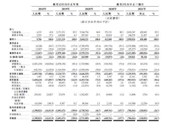根据招股书所披露的财务数据,2018至2020年,小鹏汽车的总收入分别为970万元、23.2亿元与58.4亿元,同时电动汽车交付量分别为29辆、12728辆与27041辆,增长速度十分惊人。在2021年第一季度中,小鹏汽车的营收达到29.5亿元,已超过2020年全年营收的一半,与去年同期4.1亿的营收相比,更是涨幅夸张。