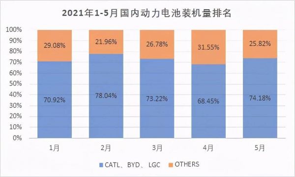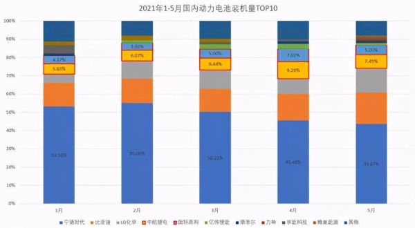从2021年1-5月国内动力电池装机量表现看,宁德时代稳居第一,但分月看,宁德时代的市场份额已从1月53.1%下滑至5月的43.67%。
