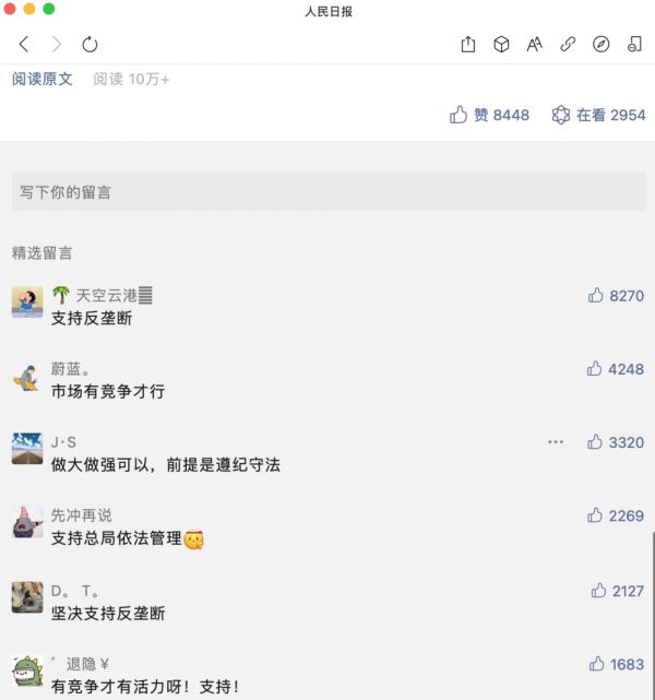 人民日报微信公众号评论区截图