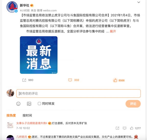 2021年7月10日,国家市场监管总局依法禁止虎牙公司与斗鱼国际控股有限公司合并。