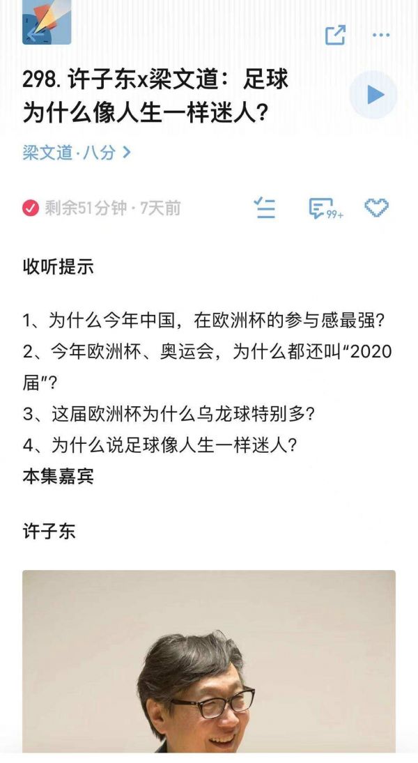 恰逢播客《八分》继上一期与作家余华对谈之后,再次迎来另一被广泛爱戴的嘉宾许子东老师做客,让听众们惊呼是又一梦幻联动,而此次道长梁文道与许子东老师对谈的主题正是借由本次欧洲杯说开去的二人都喜爱的足球话题。