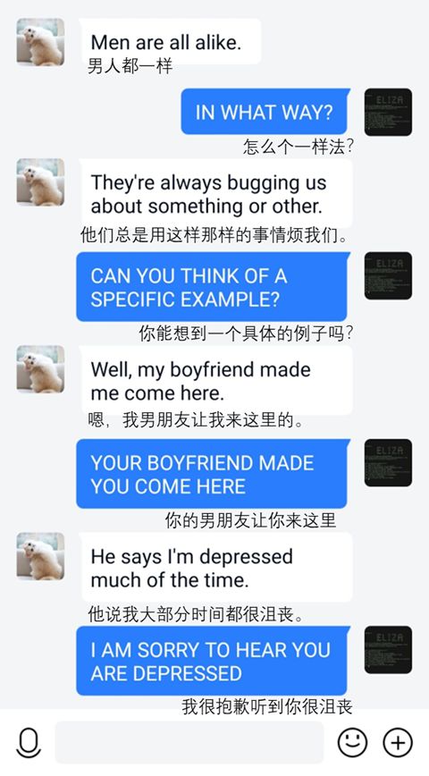 基于这种设想,魏泽鲍姆做出了一个简单的文本生成引擎,它能从输入的文本中寻找关键词,然后按固定套路把它们嵌入到回答中。在这个过程里,计算机程序完全不需要去理解文本的意义,甚至大多数时候,它只是用符合语法的方式将问题复述一遍。