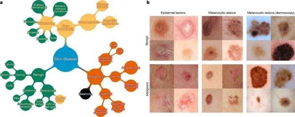 他们建立一个包含代表2,032种不同疾病的129,450张临床皮肤病图像的数据库来训练他们的算法,在确定皮肤良性病变、恶性病变和非肿瘤性病变的这项任务中,AI实现了72.1%的整体准确度,而参与实验的两名皮肤科医生在没有活检结果,仅凭肉眼识别图像的准确度则为65.56%和66.0% 。