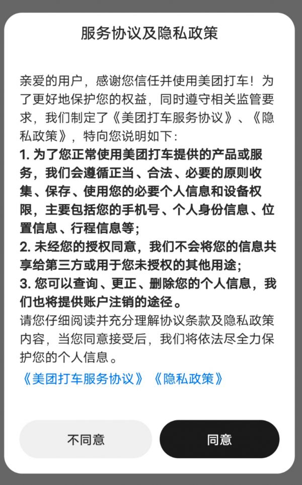 进入新版美团打车App,首先看到的是《服务协议及隐私政策》,其中1~3条特别强调了隐私问题,可以看出美团正在规避此类对于用户非常敏感的隐私问题。