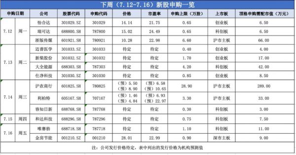 下周将有13只新股展开申购,其中沪市主板3只,深市主板1只,创业板4只,科创板5只。