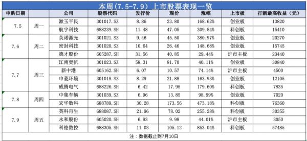本周打新收益垫底的是永和股份,一家氟化工企业。截至7月9日收盘价为9.98元/股,涨幅约44.01%,中一签的最高打新收益为3050元,本周收益榜排名垫底。