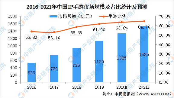 据中商产业研究院于2020年12月发布的《2021年中国手游行业市场现状及发展趋势预测分析》显示,预计2021年中国游戏玩家总数将达到6.8亿人,其中预计6.6亿为移动游戏玩家。而2021年IP手游的市场规模可达到1525亿元,占2021年手游市场份额的64.7%。可见IP手游的发展前景之大。