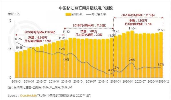 不止抖音用户,观察移动互联网的增速,也已经到了用户增长的终点。根据Quest Mobile发布的《2020 中国移动互联网年度大报告》,中国移动互联网流量接近饱和,用户达到11.55亿,同比增速持续下滑,月均同比增速从2019年的2.3%下降到2020年的1.7%,移动互联网已经进入存量竞争的时代。