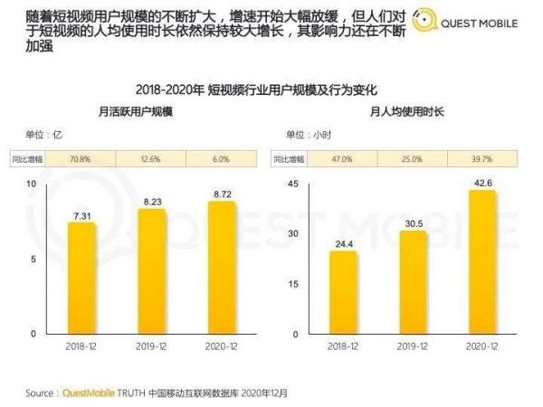 这种增速的放缓,反映到短视频上更是明显,短视频月活用户增速由2018年的70.8%降至2020年的6%。