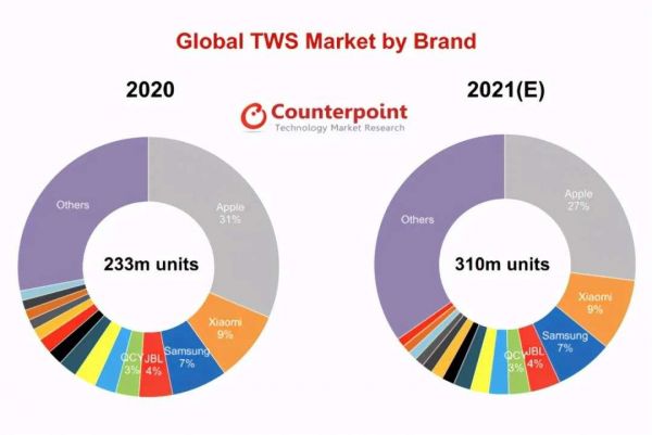 知名市场调研机构CounterPoint统计数据显示,2020年全球TWS二级市场取得了78%的同比增长,销量达到了2.33亿副。此外,该机构预测,2021年全球TWS耳机市场销量将达到了3.1亿部,同比增长33%。