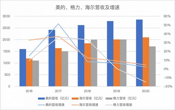 从营收数据来看,美的、格力、海尔都在2017年后遭遇了营收增速放缓的问题。4年里,美的与格力的增速都下降了约50%,格力更是在2021年出现16%的负增长。