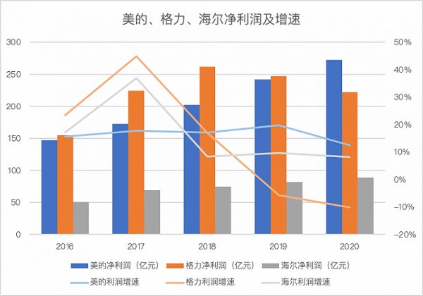 净利润方面,格力的利润增长率自2019年被美的超过以后,已经连降两年,美的则保持着较为平稳的增速。