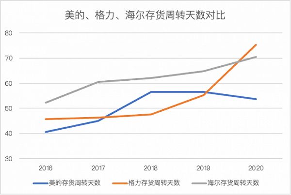 董明珠大力宣传的渠道改革看起来也收效甚微。从存货周转天数来看,2017年以来,格力的存货周转天数一直在上升,2020年的存货周转天数达到75天,说明格力有积压了较多的存货,销售状况也不如以前。