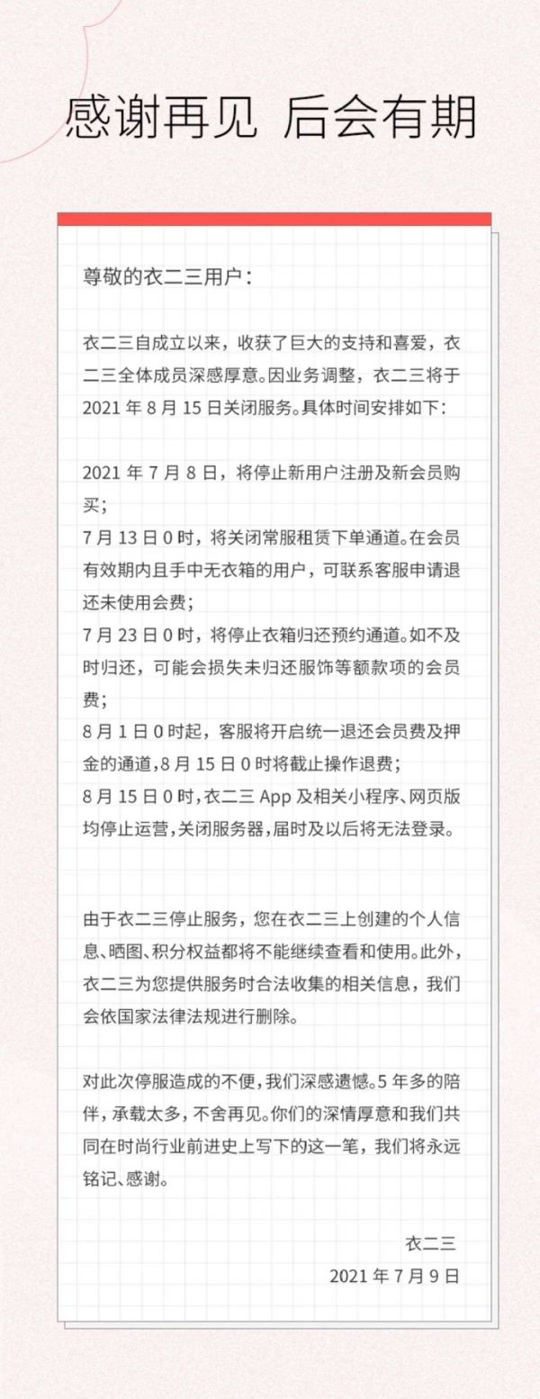 日前,衣二三发布公告称,因业务调整,停止新用户注册及新会员购买,将于2021年8月15日关闭服务。