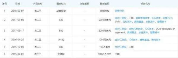 成立至今,衣二三累计获得6轮融资,总金额超过8000美元,投资方中包括红杉资本、软银中国、阿里巴巴、idg资本、金沙江创投等。衣二三天使轮阶段由滴滴早期投资人王刚投资,红杉资本、IDG资本、软银中国、真格基金等参与了后期多轮融资。