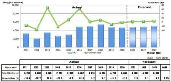 尽管市场上对相对较成熟的第6代OLED产线和第10.5代LCD产线的资本投资将在2021年放缓,但是日本半导体制造设备协会在以2020年为基准对市场环境进行审查后,认为平板显示器制造设备将与往年保持在同一水平或略有增长。