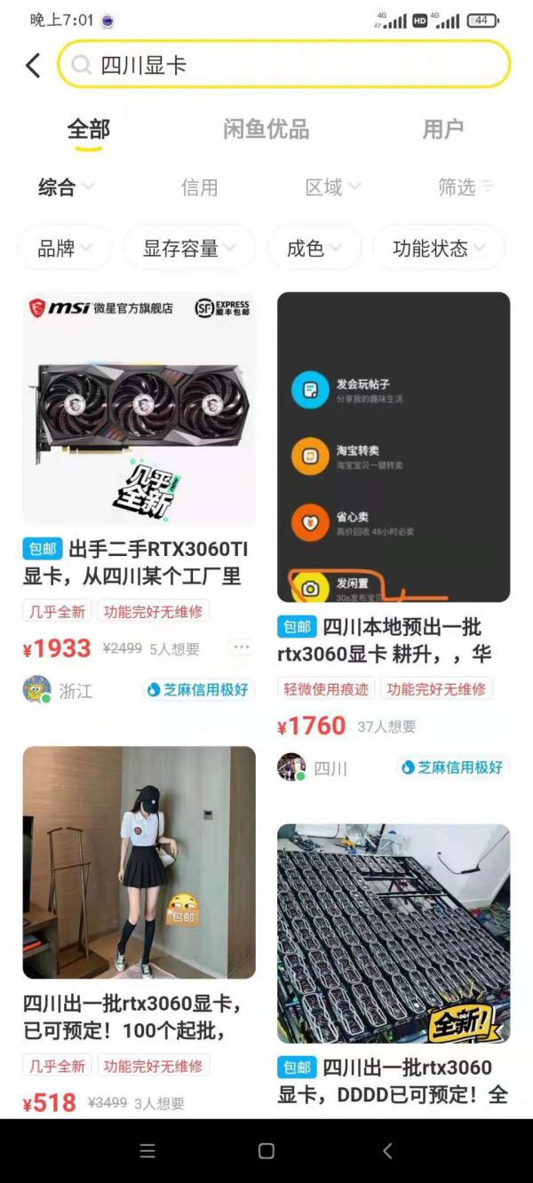 而与此同时,在二手电商平台上也有大量商家宣称,可以重金收购出自四川矿场的拆机显卡。真是有人敢卖、有人敢收。