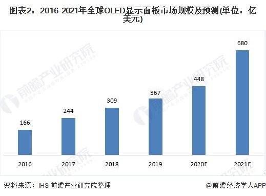 根据 IHS 发布的数据,2019 年 OLED 面板全球出货量达 7.34 亿片,比 2018 年上升了近 20%,预测2021 年 OLED 显示面板市场规模收益达到 680 亿美元。