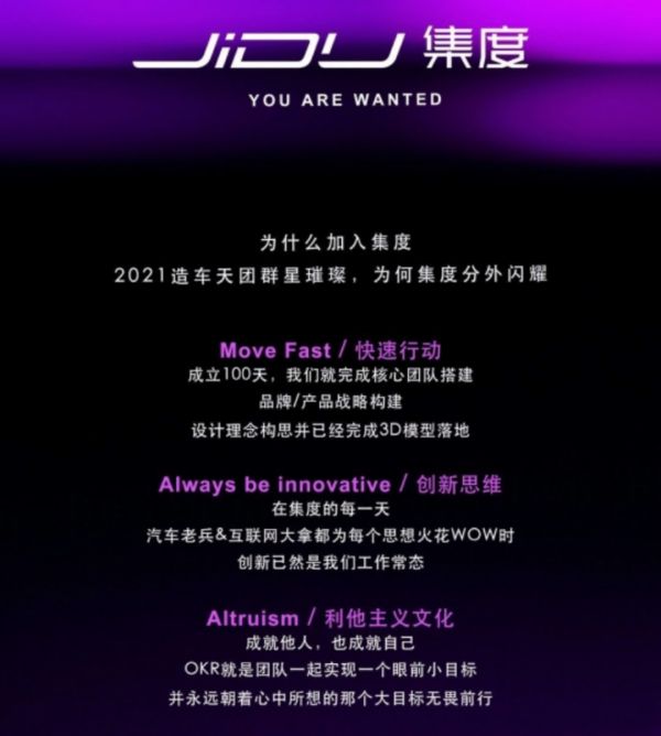 在核心管理和研发人才的招募上,集度也不甘落后。