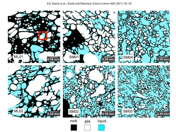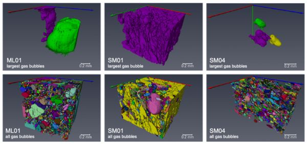 3个浮石样本中的大气泡(上)和所有气泡(下)| 图源:Fauria, K. E., Manga, M., & Wei, Z. (2017)