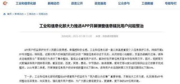 据工信部官网消息显示,工信部大力推行APP开屏弹窗信息骚扰用户问题整治一文中明确指出:对用户反映强烈投诉较多的" 弹窗信息标识近于无形、关闭按钮小如蝼蚁、页面伪装瞒天过海、诱导点击暗度陈仓 "等违规行为进行了集中整治,督促企业重视用户诉求,解决好在开屏信息页面中误导用户跳转等问题,重拳出击,才让部分像牛皮癣一样的开屏广告彻底消失。