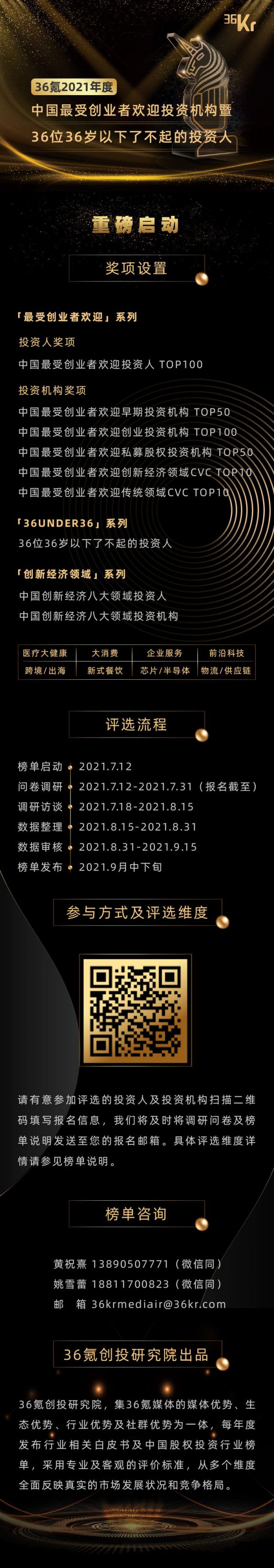 另外,我们还将同步启动「最受创业者欢迎」和「创新经济领域」投资机构/投资人两大36氪关键IP榜单的评选: