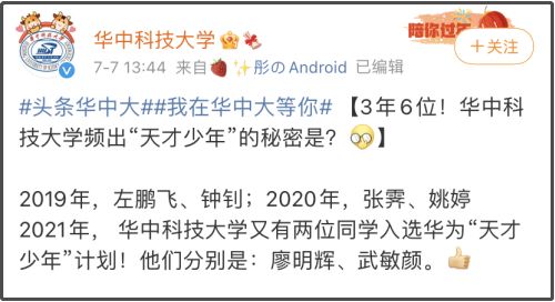 近日,华中科技大学官微发布微博,称该校有两名同学廖明辉、武敏颜入选华为“天才少年”计划。7月12日,#华为再招201万年薪天才少年#随即登上微博热搜。此前,华为每批“天才少年”计划的入选者一被曝光,总能在全网引起广泛关注和讨论。