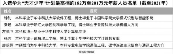 截至目前,全球范围内仅有5人获得华为“天才少年”计划最高档的182万至201万元年薪,其中4人来自华中科技大学。从这方面来看,华中科技大学算得上是华为“天才少年”计划的摇篮。