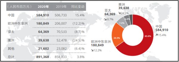 2020年,华为在欧洲中东非洲地区收入1808.49亿元,同比减少12.2%,占所有地区营收的20.3%;华为在亚太地区收入643.69亿元,同比减少8.7%,占所有地区营收的7.2%;华为在美洲的收入396.38亿元,同比大幅减少24.5%,占所有地区营收的4.4%。华为表示主要受消费者业务无法使用GMS生态的影响、部分国家运营商市场投资波动,造成海外业务的营收下降。