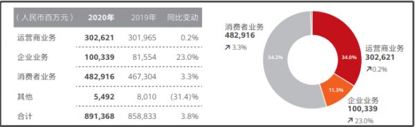 2020年,华为全年实现收入人民币8913.68亿元,同比增长3.8%。其中,运营商业务收入3026.21亿元,同比增长0.2%;企业业务收入1003.39亿元,同比增长23%;消费者业务4829.16亿元,同比增长3.3%;消费者业务占总收入的54.2%,运营商业务占比总收入的34%,企业业务占总收入的11.3%。