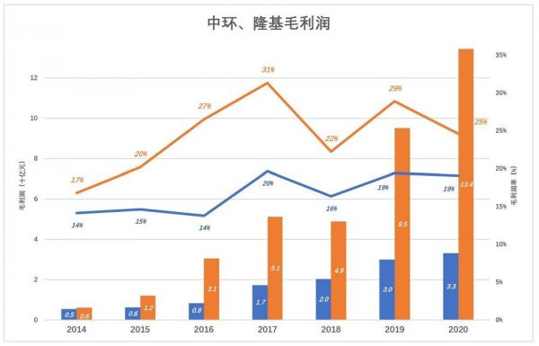 2020年,中环新能源、隆基毛利润分别为33亿、134亿,毛利润相差306%、利润率相差6个百分点(中环整体毛利润率为18.2%)。
