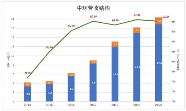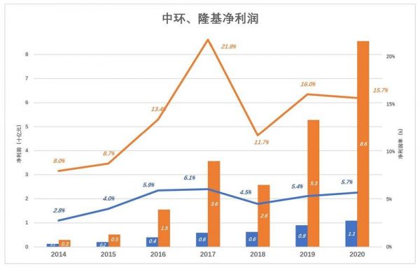 2014年,中环、隆基净利润分别为1亿、4.5亿,中环相当于隆基的22%;2020年,中环、隆基净利润分别为11亿、86亿,中环相当于隆基的时12.7%。