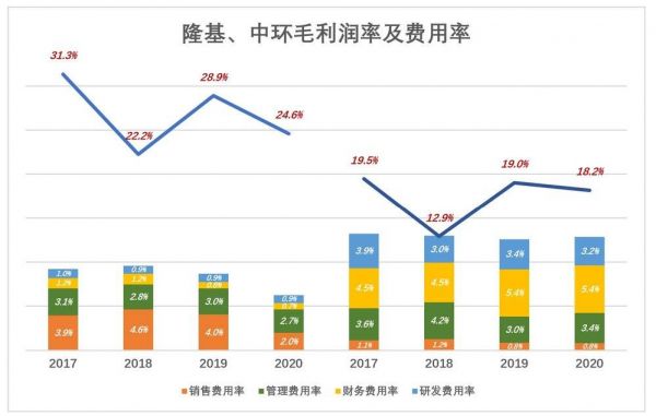 以2020财年为例,隆基毛利润率为24.6%,销售、管理、财务、研发四项费用合计占营收的6.3%;中环毛利润率18.2%,较隆基低6.4个百分点,四项费用合计占营收的12.9%,较隆基高6.5个百分点。