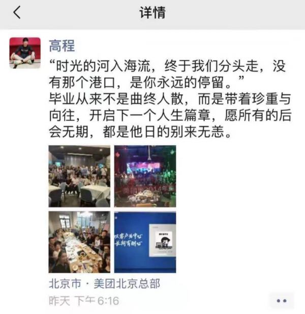 7月12日晚,高程在微信发了一条朋友圈,定位是美团北京总部,但没有提及离职原因,更多的是在感慨。上述消息人士表示,高程的离任或与美团二号人物王慧文的退休有关。眼下,由王慧文牵头的这一业务,从后疫情时期的高歌猛进,已近乎接近于“半放弃的状态”。