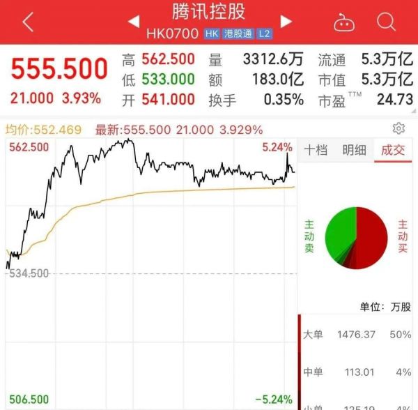 受此消息影响,腾讯控股股价一度涨超5%。截至收盘,腾讯控股报收555.5港元,上涨3.93%,市值飙升超2000亿港元。
