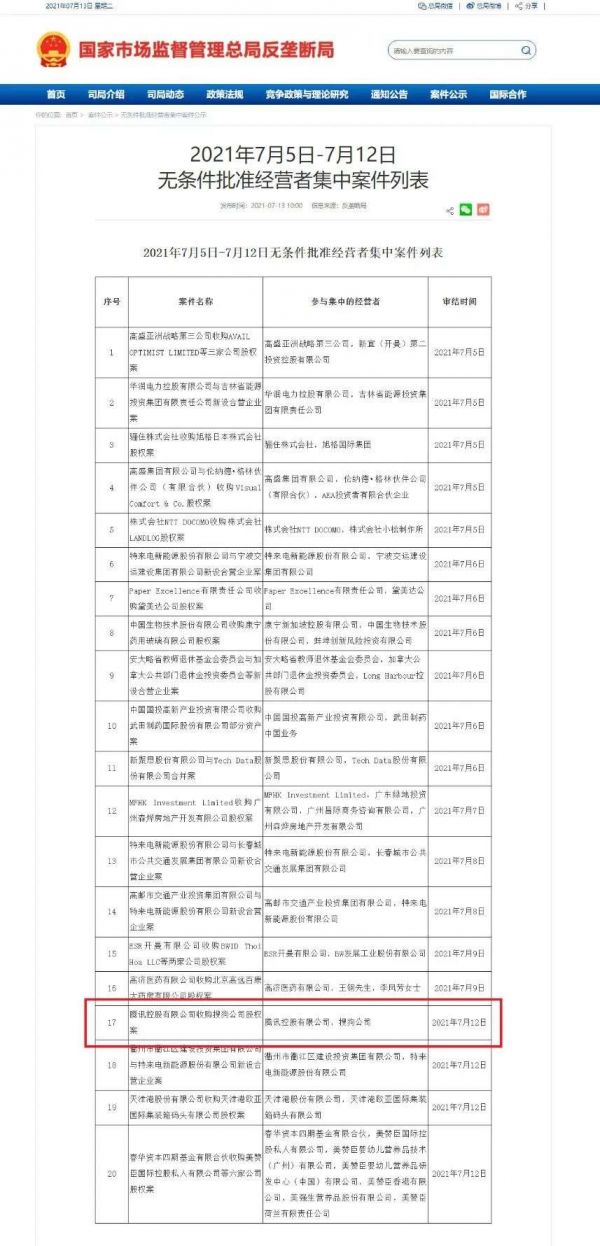 7月13日上午10点,国家市场监管总局官网发布“2021年7月5日-7月12日无条件批准经营者集中案件列表”显示,国家市场监督管理总局反垄断局已无条件批准腾讯控股有限公司收购搜狗公司股权。