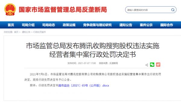 而就在一周前的7月6日,市场监管总局对腾讯控股有限公司收购搜狗公司股权违法实施经营者集中案作出行政处罚决定。
