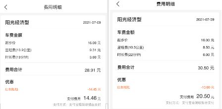 她给深燃展示了最近在美团打车APP上的两笔消费账单,这两笔账单都是10公里左右的路程,由于平台给出了优厚的新人补贴,其中一单优惠了10元,另一单优惠了14.45元。对比来看,同样的路程,佳佳平日里用滴滴APP打快车一般会花费30元左右 (无优惠券的情况下) ,打出租车则一般需要支付32元左右。
