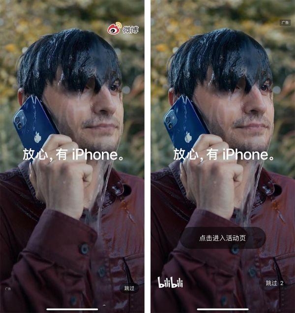 1、产品角度:从产品功能宣传方面,明显苹果意在宣传iPhone12的防水功能,具有视觉冲击力的开屏广告,做到了抢夺用户的注意力,场景化的创意也在直击痛点,让用户很容易记住「iPhone12+防水」。