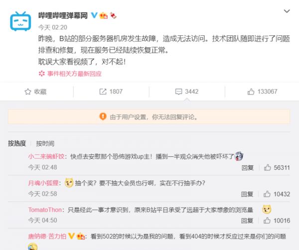 凌晨三点,B站在微博和网站内对宕机事件进行回应。来源:微博