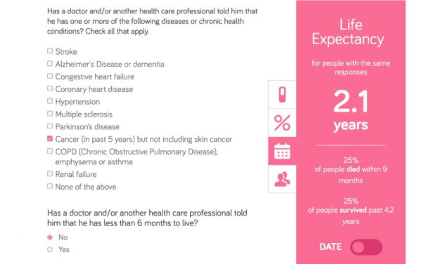 而“生命倒计时”这种似乎只会出现在电影里的事物,现在却真的以科学的形式跟我们见面了。上周,加拿大健康计算研究小组 Project Big Life 的科学家们正式发布并上线了一个针对部分老年人的寿命计算器,能够高度准确地预测老人6个月内的死亡概率。