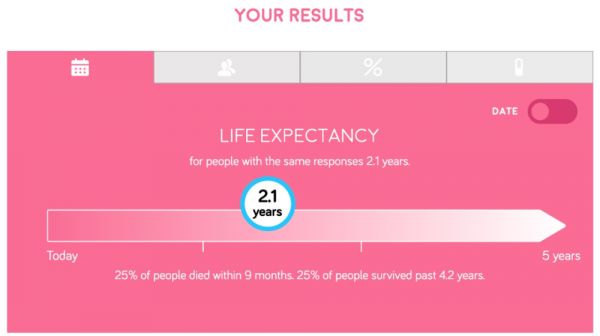 在你回答第一部分问题后,右侧就会出现一个寿命预测栏,显示出给出同样回答的老人一般剩余寿命是多少,数字会根据你给出的答案在几周到5年之间变动,并将患者的死亡风险分为低、中、高或非常高。