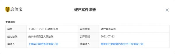 启信宝数据显示,7月12日,拜腾汽车关联公司南京知行新能源汽车技术开发有限公司新增破产重整信息,案号为(2021)苏0113破申26号,经办法院为南京市栖霞区人民法院,申请人为上海华讯网络系统有限公司。