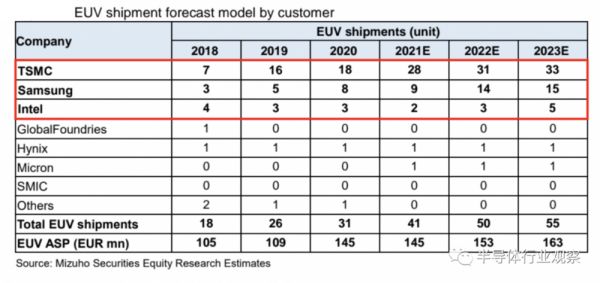 据Mizuho Securities Asia Limited的一份关于ASML的报告,其预测了EUV客户台积电、三星、英特尔的购买情况,如下图所示,相对来说,英特尔处于落后地位,这与其在工艺节点的落后有关。